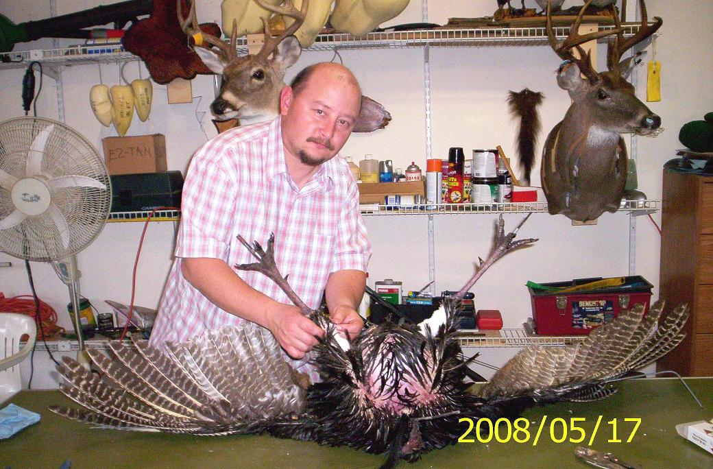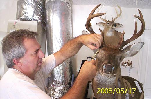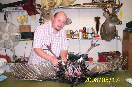 few thousand more. I am a professional wildlife biologist, a hunter and a taxidermist. After studying animals for 5 years in Europe (for a medical veterinary degree) and 3 more years in Canada (master's degree in biology) I kind of have an idea about animal anatomy. What you can get with me is a nice mount for less than the average price. This includes the panels for shoulder mounts and all the woodwork for the birds and small mammals. The wood is nicely finished with polyurethane and the back is professionally lined with felt so it will not damage your wall. Also, I do detailed work on all deer heads, like veins on the face and neck muscles. Here is a recent picture of me finishing a deer: And here is a friend from Canada who came to learn how to mount turkeys: Thank you for visiting and please take a few moments to look at some of my recently completed work. Price ListJust for you to get an idea, here is the price for the most common mounts: Deer
